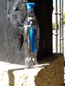 So I retreat to the town and explore the first couple of streets but they all follow a pattern of arcades selling religious ornaments, icons and other forms of souvenir. The statues of the Madonna range from a few centimetres to over a metre. The oddest, to me at least, are the ‘water bottles’. These are plastic containers in the form of Mary, or Bernadette, sometimes both. Again they range in size but their purpose is to hold holy water from the Spring. Mary has a crown, which doubles as a filler cap.